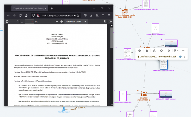 LinkFacts has different highly customizable visualization modes, including text and table modes. In our current example, it is possible to only view the official general assembly’s documents.